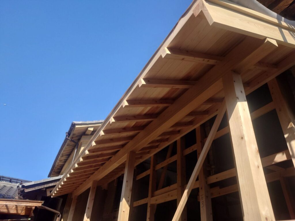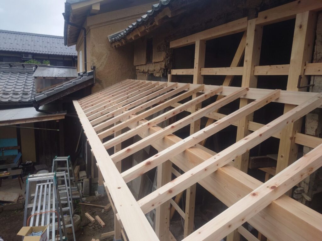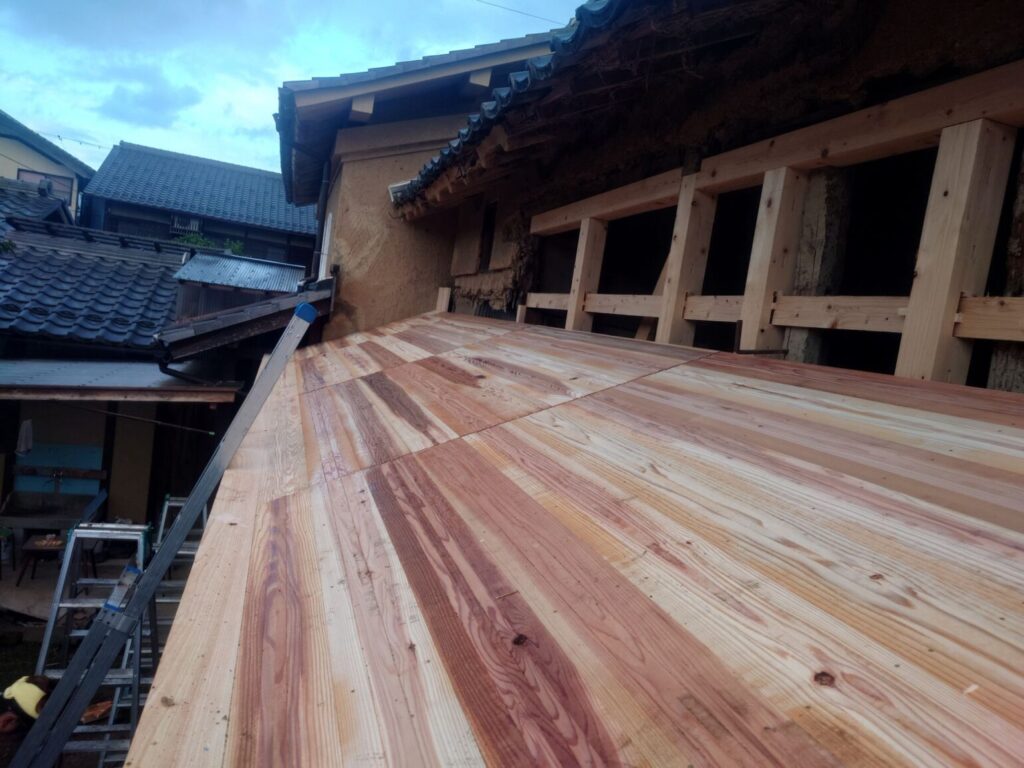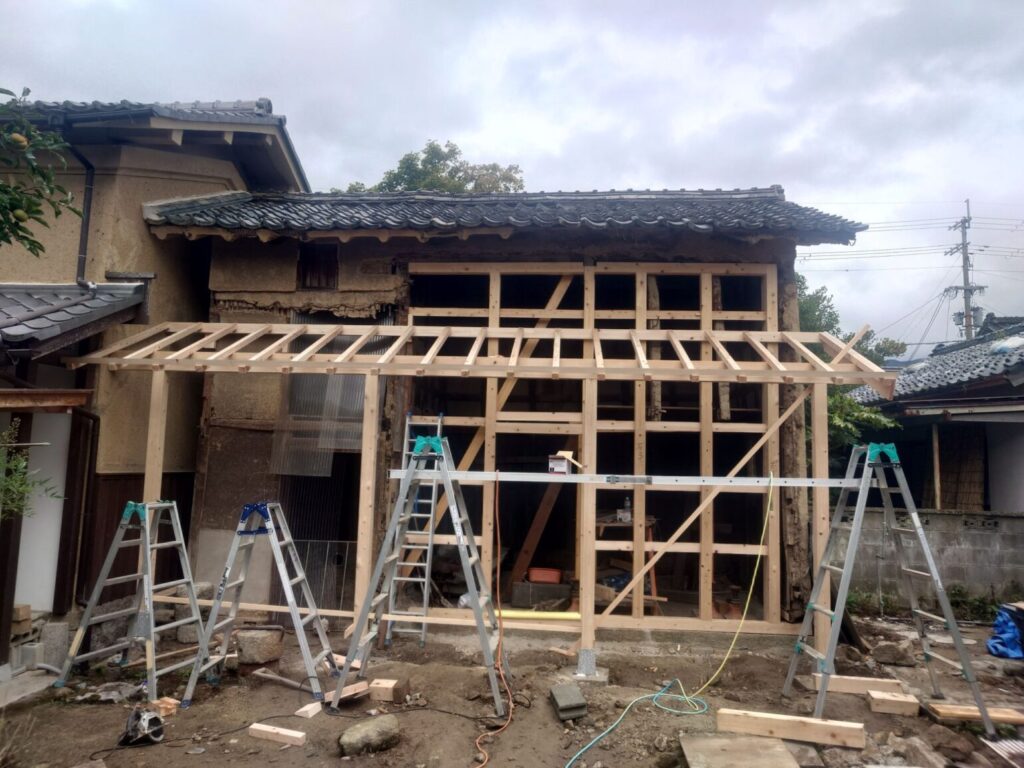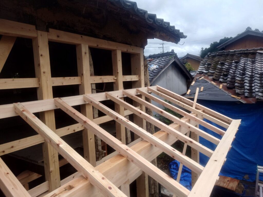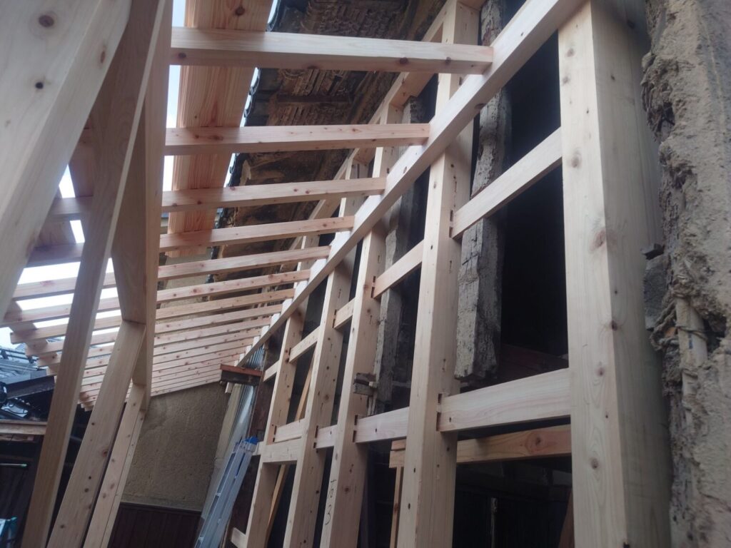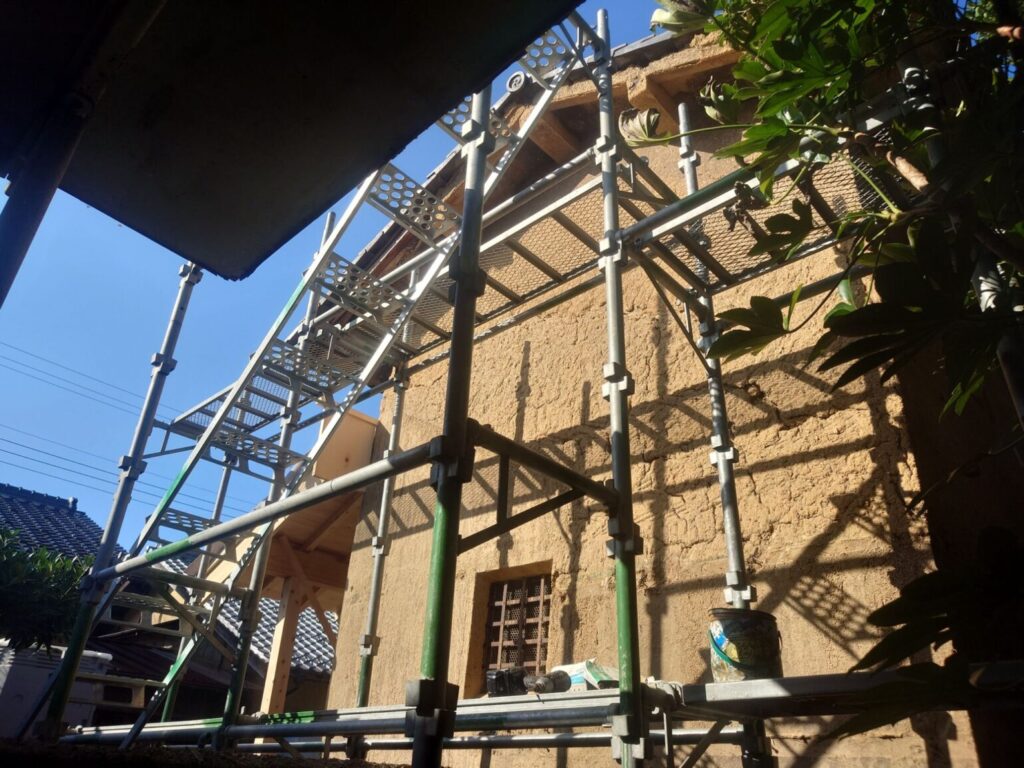 翌日に瓦屋さん、左官屋さん、板金屋さんがスムーズに仕事が出来るように足場を組みました。